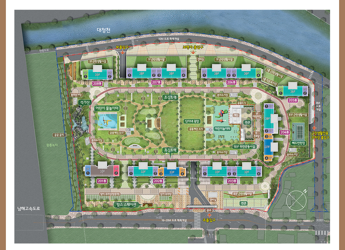 - 본 아파트 단지 측면에는 남해고속도로가 인접하여 도로교통소음 등이 발생할 수 있으니 이를 인지하시기 바랍니다.
