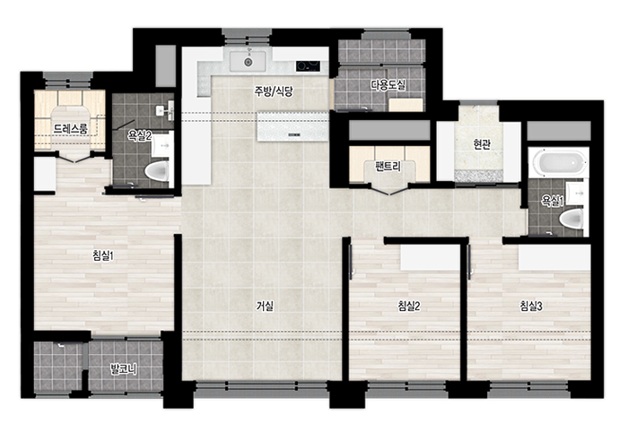 - 팬트하우스의 테라스 바닥색상은 실제와 다를 수 있으며, 측면 난간대 및 벽면은 동별로 상이 할 수 있습니다.