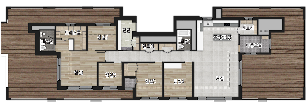 - 팬트하우스의 테라스 바닥색상은 실제와 다를 수 있으며, 측면 난간대 및 벽면은 동별로 상이 할 수 있습니다.